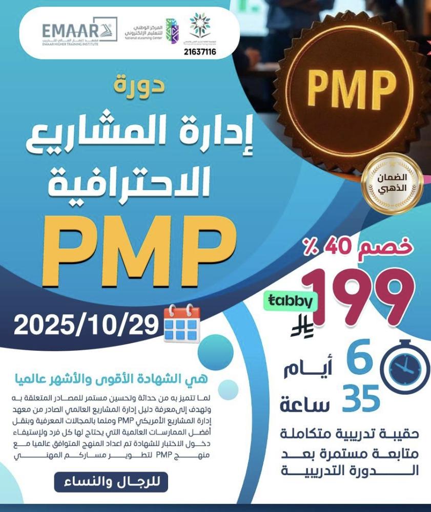 إذا كنت تطمح للتميز في إدارة المشاريع، فشهادة PMP هي المفتاح! تعتبر من أقوى الشهادات عالميًا في هذا المجال، وتعتمد على أفضل الممارسات العالمية في التخطيط والتنفيذ والإشراف على المشاريع بجميع أنواعها.